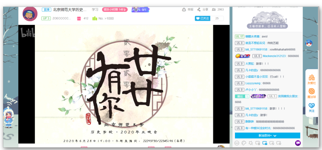 2020年6月28日晚19:00,新爱体育(官网)官方网站2020届“廿廿有你”毕业晚会在哔哩哔哩平台成功举办。晚会时长近两个半小时,直播人气峰值达到3000以上,为观众们呈现了一场精彩、难忘的视觉盛宴。