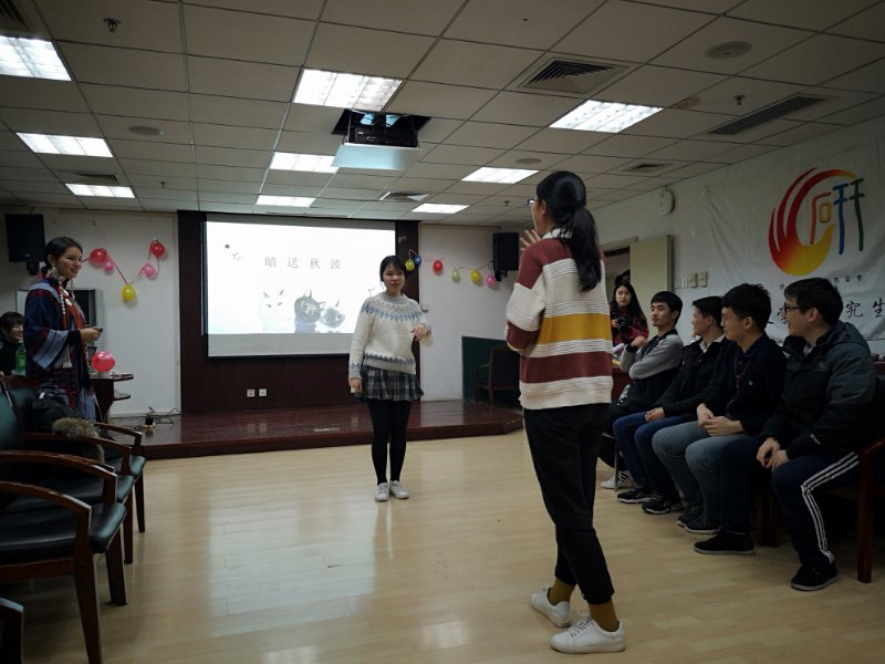 结束了第一阶段的表演后,游戏环节开始了。多位同学积极参加了“你划我猜”的游戏,游戏分为五组,同学们根据一些网络流行语、历史名词等进行了比划和猜,现场气氛热烈,同学们通过游戏加深了了解,深化了友谊。
