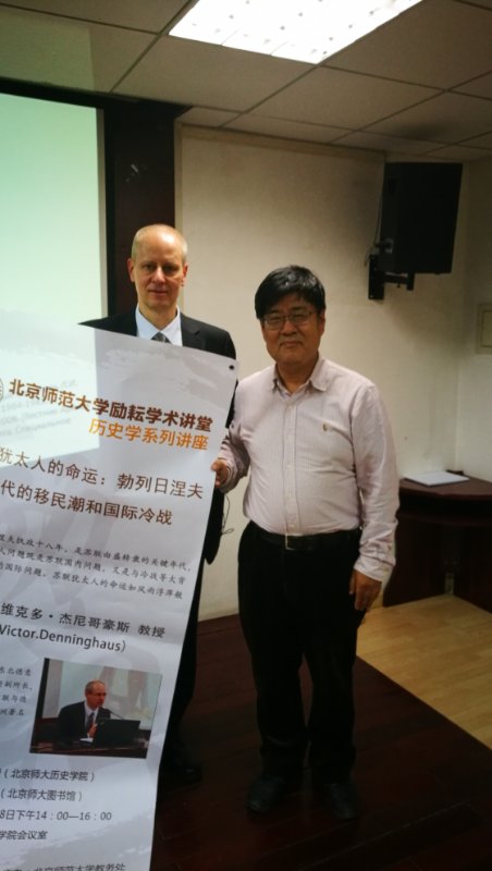 3月28日下午,德国汉堡大学-东北欧德意志人历史文化研究所副所长维克多·德宁豪斯()教授在前主楼600教室举办了题为“苏联犹太人的命运:勃列日涅夫时代的移民潮和国际冷战”的学术讲座。本次讲座由历史学院世界近现代史研究中心主任张建华教授主持,我校图书馆研究馆员俞紫梅担任全程翻译。来自我校各院系的二十余名师生听取了讲座。