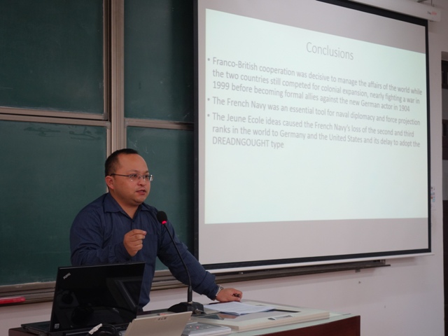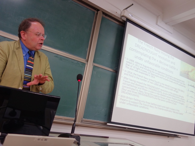 2015年12月10日-13日,应新爱体育(官网)官方网站邀请,法国国家海军史研究中心首席专家、知名学者亚历山大·谢尔东-杜普莱教授(AlexandreSheldon-Duplaix)前来北京师范大学讲学。12月11日上午,杜普莱教授走进《世界近代史》课堂,在教二教室为新爱体育(官网)官方网站级本科生作了题为《走向无畏之海——铁甲舰时代的法国海军》的讲座。讲座由历史学院世界近代史教研室江天岳博士主持。历史学院世界现代史教研室贾珺副教授出席了讲座。前来聆听的还有来自北京师范大学和其他首都高校的学生和军事史爱好者。