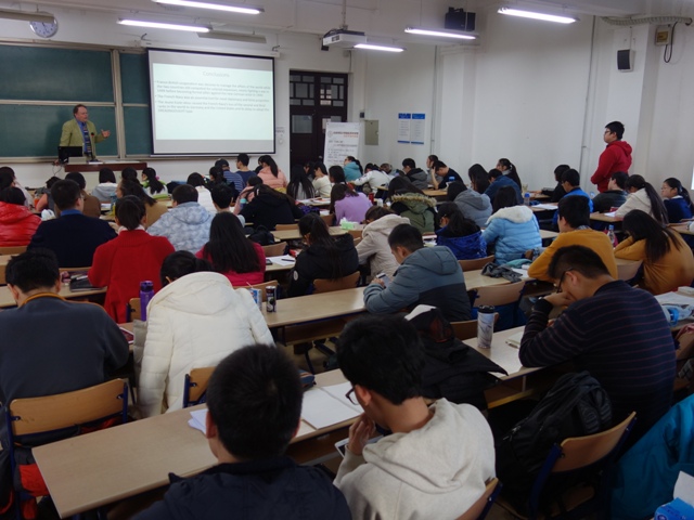 在一个多小时的英语授课中,杜普莱教授没有采用传统的政治史讲述方式,而是从军事和技术史角度呈现了拿破仑战争结束一个世纪以来法国海上力量的兴衰、海上外交政策的变化和与各国海军力量竞争的历史,对《世界近代史》课堂教学中涉及的美国革命、拿破仑战争、拉美独立运动、工业革命、克里木战争、德意志统一等重大历史事件进行了有力串联,丰富了课堂教学形式和内容,也锻炼了学生的英语能力。讲座后,杜普莱教授回答了学生提问。贾珺副教授对杜普莱教授的授课进行了简要点评,对其专程来我院与本科生分享学术前沿成果表示衷心感谢,希望双方在海军史、国际关系史等研究领域互通有无,持续开展合作,提升学术交流水平。