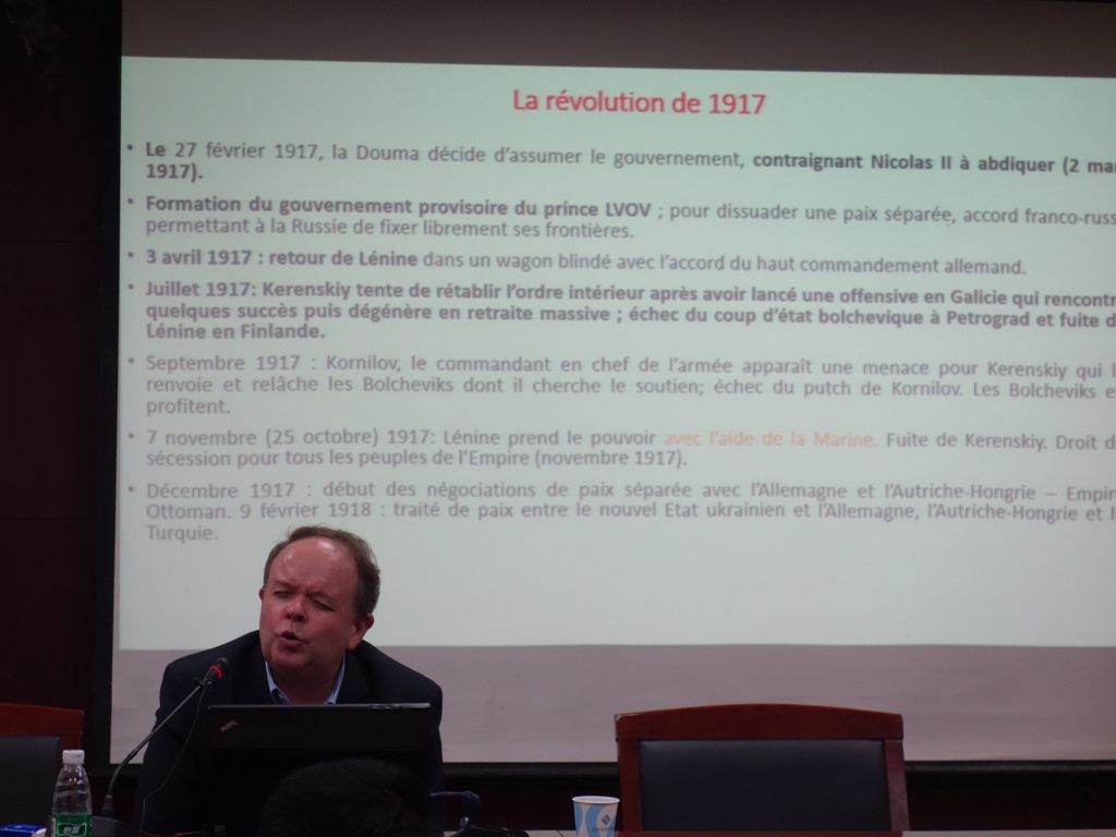 5月27-30日,应新爱体育(官网)官方网站邀请,法国国家海军史研究中心首席专家、知名学者亚历山大.谢尔东-杜普莱教授(Alexandre Sheldon- Duplaix)来我校访学。5月29日下午,杜普莱教授在主楼600会议室作了题为“1917年前的沙俄海军”的学术讲座。本次讲座系我校励耘学术讲堂历史学系列讲座之一,也是纪念俄国十月革命100周年专题学术活动的重要部分。讲座由历史学院世界近代史教研室江天岳博士主持,历史学院世界近现代史研究中心主任张建华教授、世界现代史教研室主任安然老师、世界现代史教研室王广坤老师等出席了讲座。