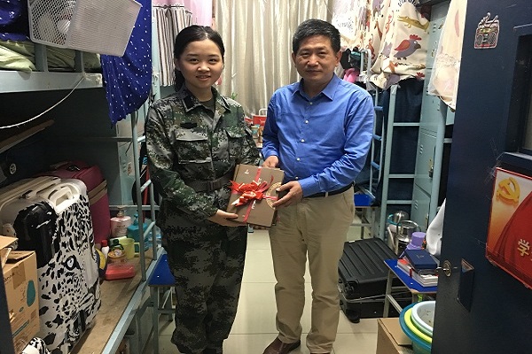 响应国家应征入伍号召,今年我院共有两名本科生顺利入伍,分别是2016级本科生杨宇和2015级本科生张颖。学院分党委对此高度重视,分党委书记郭家宏、分党委副书记王卓凯、2016级本科班班主任倪滕达、2015级本科班班主任江天岳和专职辅导员李力专程到宿舍走访慰问了两名入伍大学生。