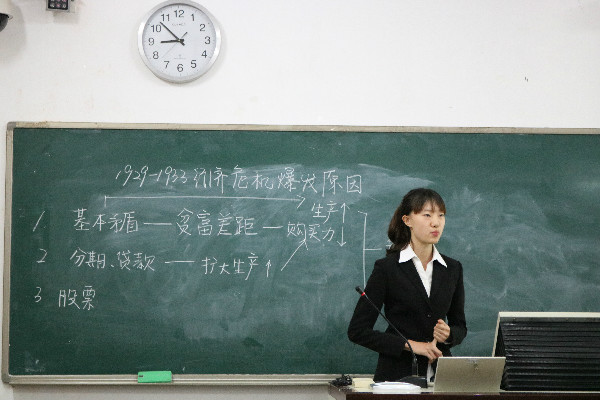 第八位选手田欣怡讲述的内容是“1929-1933经济危机的原因”。田欣怡根据材料,清晰地向大家展现了美国经济危机爆发的原因,课堂内容重点明确,框架清晰,内容充实。
