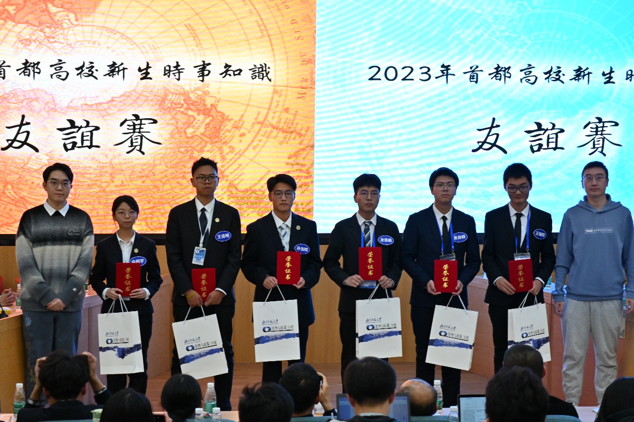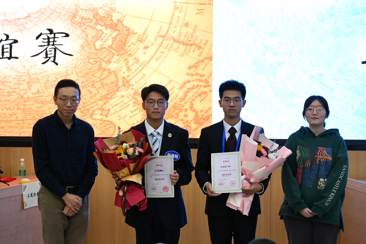 一番角逐过后,由北京师范大学文学院和历史学院2023级本科生组成的3号芝兰玉树代表队以4000分的成绩拔得头筹,国际关系学院2号观古知今代表队斩获亚军,国际关系学院1号正道沧桑代表队和北京师范大学4号含光却邪代表队获三等奖。来自国际关系学院文化传播系的孙浩翔和来自北京师范大学文学院的池宜洋在本次比赛中展现了深厚的时事功底和出色的表达能力,荣获“最佳风采奖”。