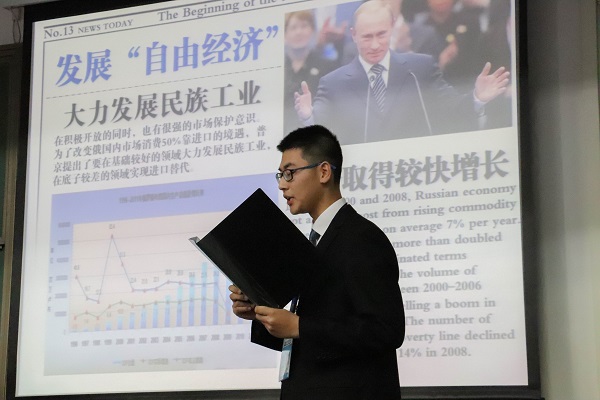 第四组代表、哲学学院2018级的赵乾同学向大家做了《跌宕起伏的发展之路——浅析普京执政二十年》的展示。精彩的开场视频成功吸引了观众们的眼球,随后,赵乾同学从三个方面展开论述,全面而详细地展示了普京这位极富个性的政治家的铁腕手段与钢铁雄心,并指出俄罗斯在这些年的发展中既高潮迭起、也曾在低谷徘徊,最后分析了俄罗斯当前的困境与普京需要解决的问题。