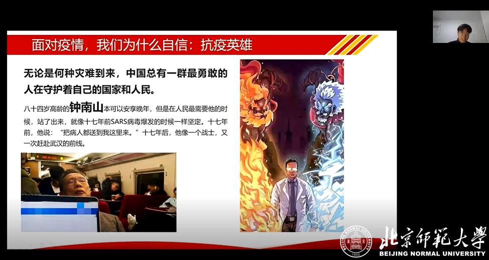 “英雄的关键在哪儿?不在于他外在的外表是什么样的,而是在于他的内心,在于英雄的精神特质。”屏幕前,历史学院2019级硕士生王一帆铿锵有力地说道。