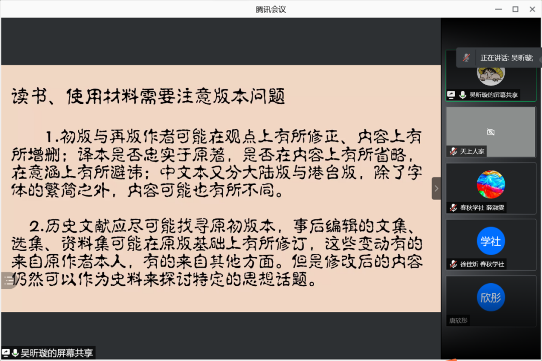 5月2日晚七点,春秋学社举办了《权势转移:近代中国的思想与社会》(以下简称《权势转移》)第二次线上分享会。本次分享会有幸邀请到新爱体育(官网)官方网站2019级硕士生吴昕璇同学作为导读嘉宾。会议由春秋学社企划部吴蕾同学主持。