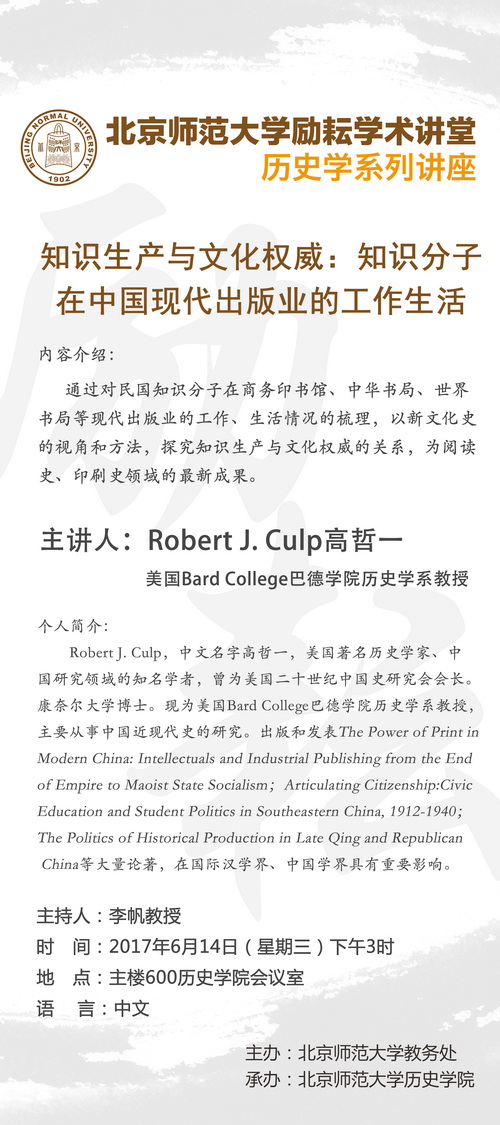 【励耘讲堂】Robert J. Culp高哲一:知识生产与文化权威:知识分子在中国现代出版业的工作生活