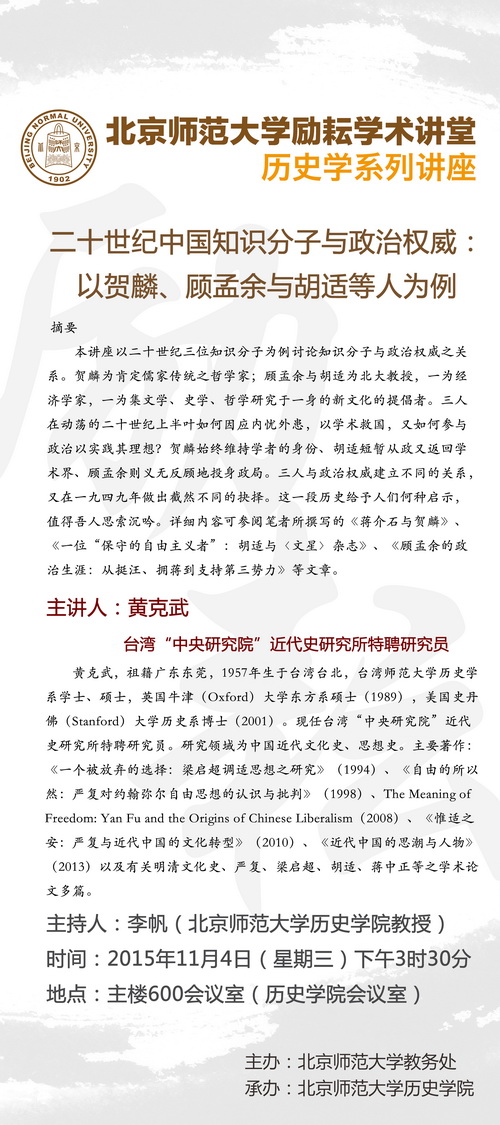 【励耘讲堂】黄克武:二十世纪中国知识分子与政治权威:以贺麟、顾孟余与胡适等人为例