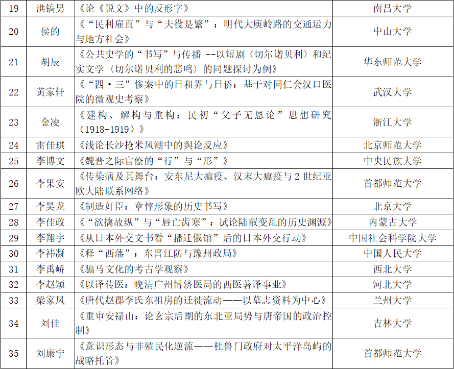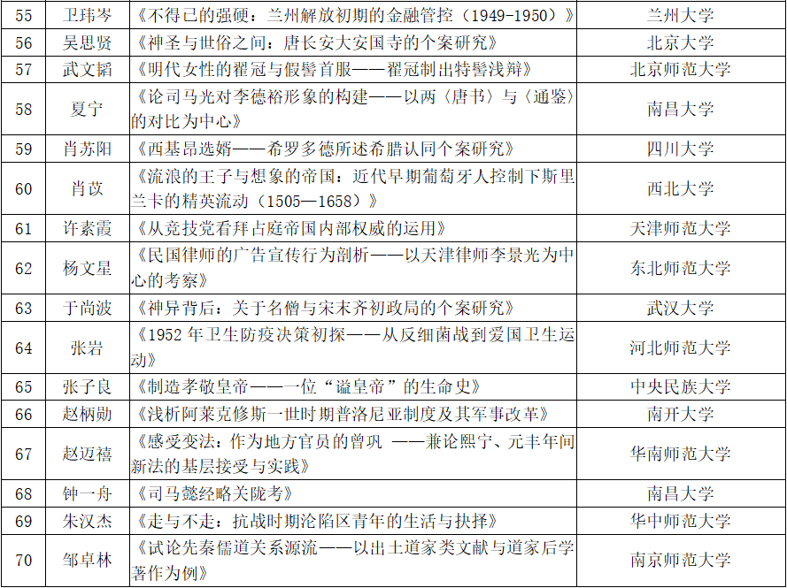 自2020年9月7日春秋学社微信公众号“学问60秒”发布征稿通知以来,论坛组委会共收到来自北京师范大学、北京大学、清华大学、中国人民大学、中国社会科学院大学、南开大学、复旦大学、浙江大学、武汉大学、中山大学等全国63所高校在读本科生投递的226篇有效稿件。经相关专家双向匿名严格评审,组委会从中遴选出70篇优秀作品。现将入围名单公示如下(以姓名拼音为序):