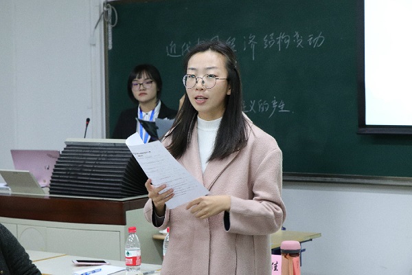202教室比赛的评委有新爱体育(官网)官方网站孙会修老师和丁昊师姐。第一位上场的是历史学院的张端成选手,他以“罗斯福新政背景”为课题,重点讲述了美国经济危机前采用的自由放任政策这一历史道路。他运用了大量史料,同时在PPT的展示上将图文充分结合,增加了课程的趣味性与吸引力,展示出该选手深厚的史学功底。第二位上场的选手是历史学院的田欣怡。她所讲的“1929-1933资本主义世界经济危机爆发原因探究”一课,通过有关材料合理推导出危机爆发的诸多原因,令在场的人不禁击节赞叹。六位选手展示完毕,两位评委在教态台风、语速节奏、亮点呈现、图文设置和重难点把握等方面为选手们提出了建议,使选手们得到了经验和提升。最后张端成和田欣怡两位选手分获第一与第二名。