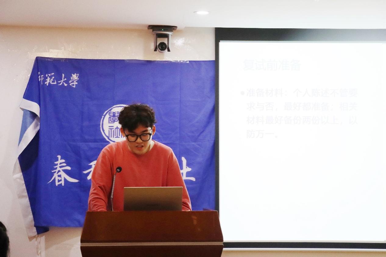 接下来,韦兆杰同学就中国史专业现当代史方向分享备考经验。他逐一说明了信息搜集、材料准备及临场发挥等各个环节中需要注意的问题。同学们应通过多种渠道广泛搜集目标院校的相关信息,用心撰写出富有特色的个人陈述,准备多份材料以应对可能的突发需求。结合自己的面试经历,他还建议同学们务必提前做好充分准备,同时根据现场情况灵活应变。
