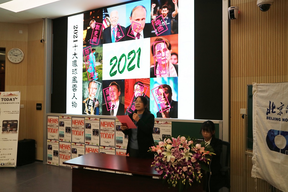 活动中,赵云慧老师揭晓了我校学生自主评选的“2021十大环球风云人物”。展示期间还穿插进行了“人物迷踪”、“挑战十大人物”等知识性与趣味性兼备的时事知识互动环节,通过游戏的形式引导同学们关注国内外时事、拓宽国际视野。