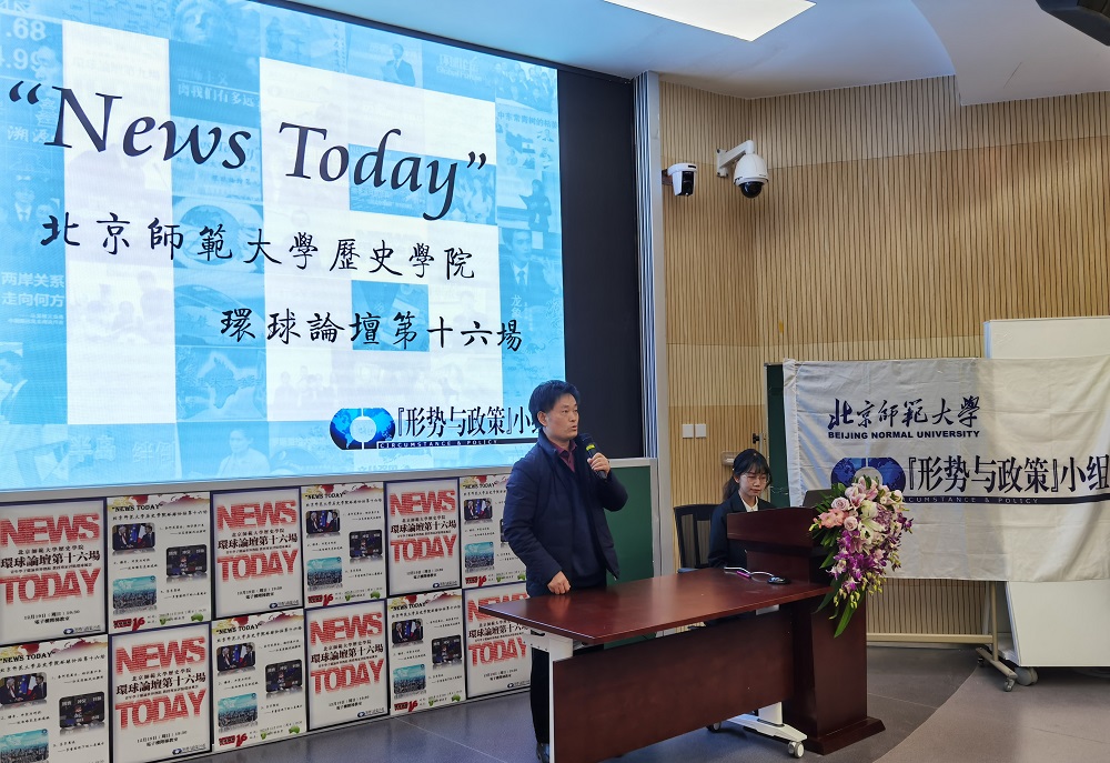 12月19日晚,“News Today”新爱体育(官网)官方网站环球论坛第十六场在我院隆重举行。活动由北京师范大学党委学生工作部、历史学院主办,我院“形势与政策”小组承办。北京师范大学党委学生工作部部长隋璐璐老师,校党委学生工作部辅导员发展中心牛小游老师,历史学院院长张皓教授,世界现代史教研室主任安然教授,考古与博物馆学教研室副教授单月英老师,世界近代史教研室副教授贾珺老师,中国近代史教研室副教授湛晓白老师,历史学院党委副书记赵云慧老师,团委书记胡小溪老师,历史学院2021级本科班班主任吴愁老师,2020级本科班班主任张辞修老师、徐晓枫老师应邀出席活动。第二十二届北京师范大学“十佳大学生”获得者代表、新爱体育(官网)官方网站各社团代表等应邀参加。