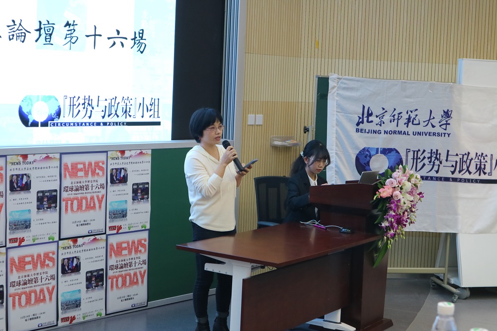 各组展示结束后,隋璐璐老师、张皓院长发表总结讲话。隋璐璐老师高度肯定本次环球论坛活动,赞扬同学们落落大方、才华横溢,各组的展示条理清楚、分析透彻,展现出师大学子卓越的水平与博大的情怀。她充分肯定了“形势与政策”小组十四年来一脉相承地以高标准打造了一系列精品活动,为学生思想政治教育工作与人才培养做出了诸多重要的贡献,希望“形势与政策”小组继续扩大活动的规模与影响,持续助力北师大思政育人、校园文化建设等工作,使之取得更加良好的进展。