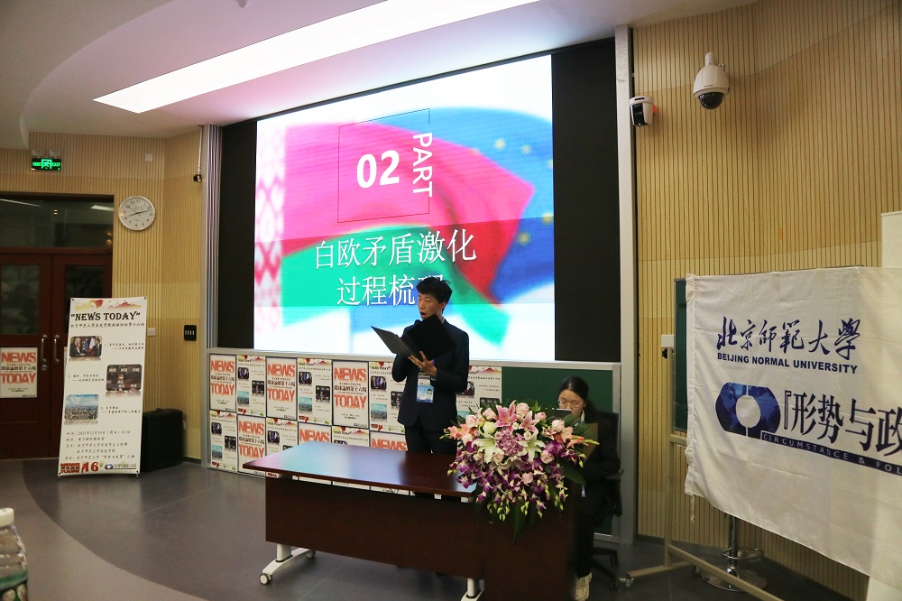 第二组代表、历史学院2021级本科生牛广鹏主讲《博弈、冲突与对抗——波白难民危机透视》。他从近期波兰与白俄罗斯边境的难民危机出发,介绍了白俄罗斯与欧盟的历史恩怨,以及2020年白大选以来白、欧边境局势逐步激化直至爆发此次难民危机的过程。安然教授在点评中充分肯定了第二组同学对选题的深刻挖掘与人道主义关怀。她指出,由波、白双方可以进一步联系到难民问题的缘起,即中东国家现代化转型中的种种问题,希望同学们通过白俄罗斯的国家体制、欧盟的运作形式等视角,关注白欧、俄欧关系背后深刻的思想与政治根源。