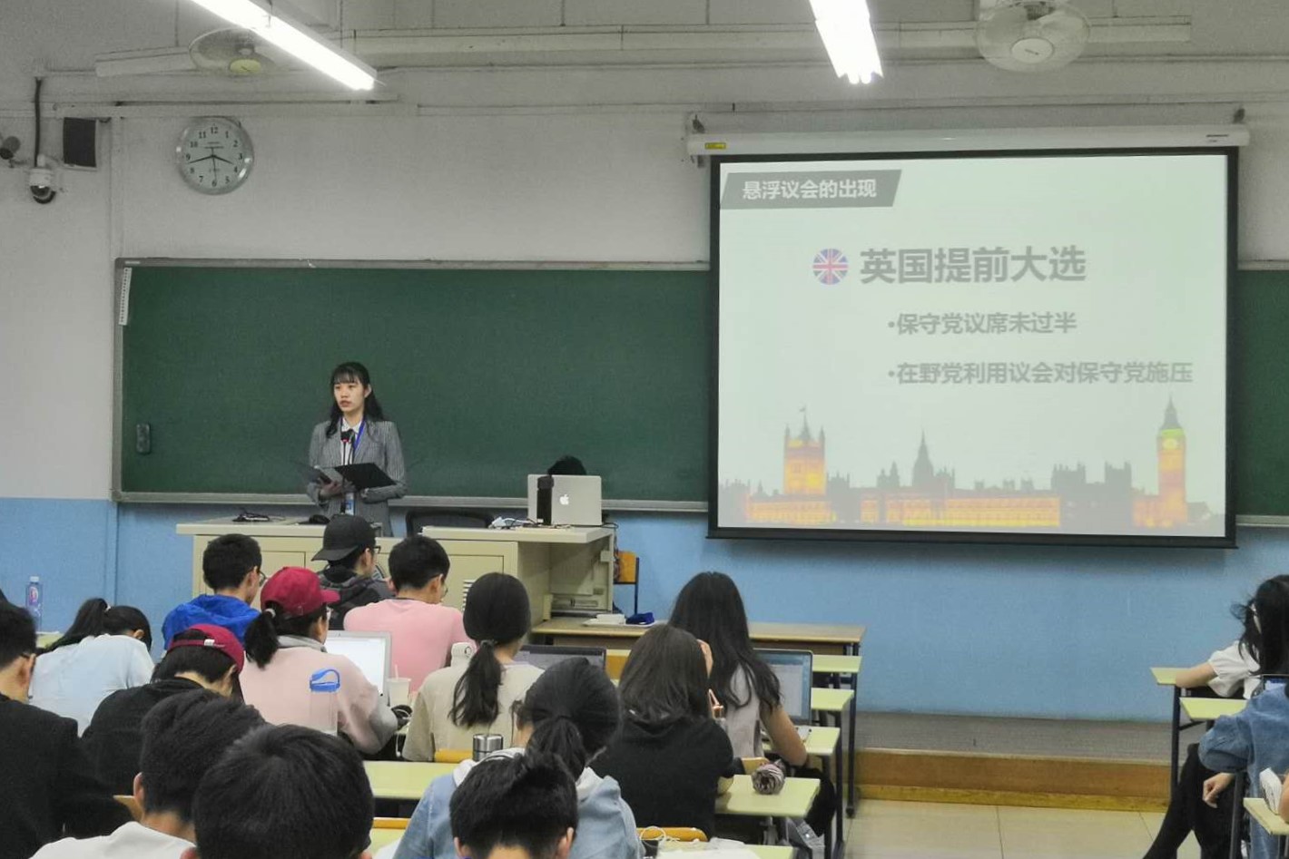 5月13日,应马克思主义学院高超老师邀请,历史学院2018级本科生王冰、熊太波同学走上《思想道德修养与法律基础》课讲台,为同学们带来别开生面的一堂“国际形势专题”课。课堂上,他们为理工类专业的本科生进行题为“英国脱欧——难以出鞘的双刃剑”的授课。王冰同学在课上首先分析了英国脱欧的现今局势,并以此为引,回顾从2013年时任英国首相卡梅伦首次公开谈及脱欧伊始到如今特蕾莎·梅的艰辛谈判,细数每一个节点的艰难跨越——从打开“潘多拉魔盒”的移民问题到贸易问题的“戈尔迪之结”,再到现代巴别塔般的英国议会,生动地展现了英国脱欧过程中的蹒跚前行。