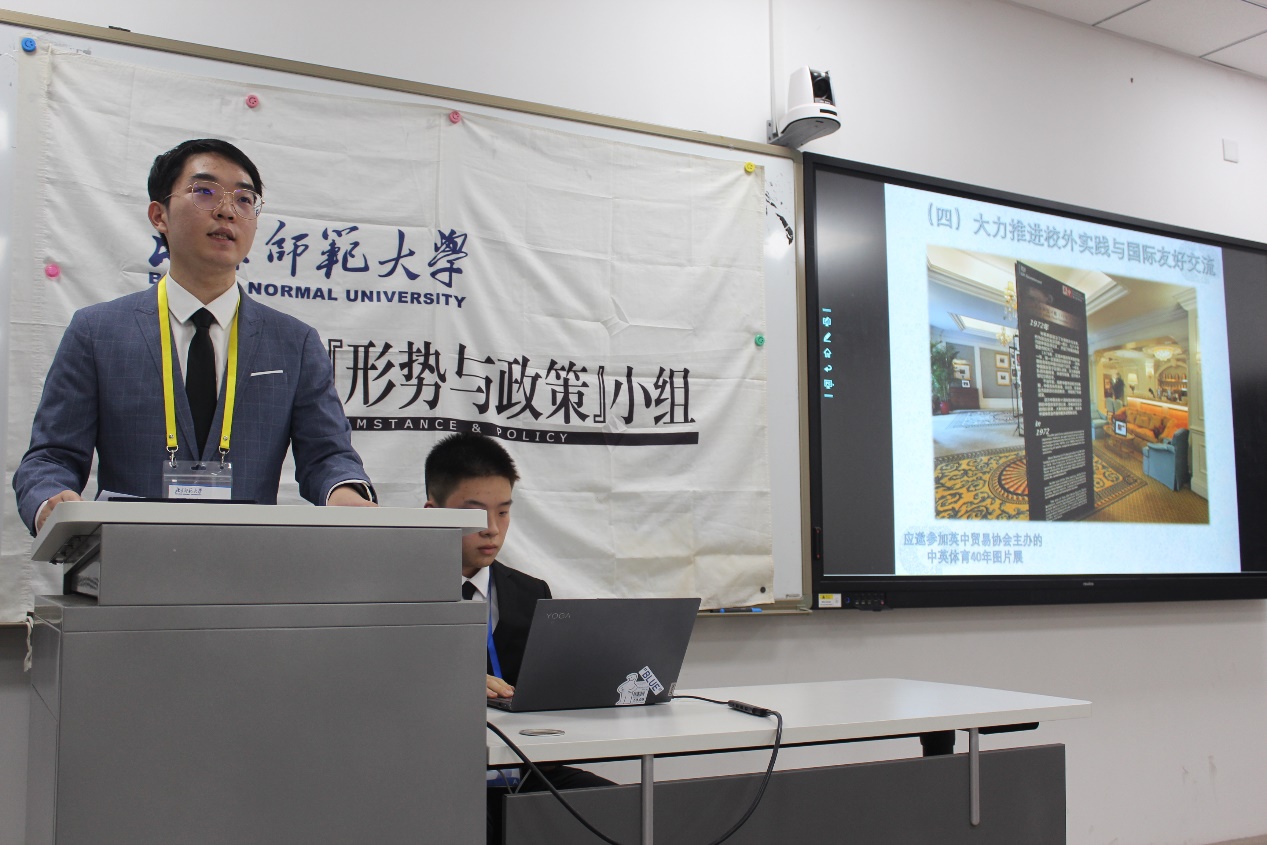 总结会开始后,第十五届“形势与政策”小组组长许宸睿作《新爱体育(官网)官方网站“形势与政策”小组2021-2022年度工作报告》,全面总结了“形势与政策”小组本学年工作。《报告》指出:本学年,“形势与政策”小组在学校和学院的悉心指导和大力支持下,继续完善组织建设、充实常规活动,全面配合学校《形势与政策》课程建设工作,大力推进体制机制创新和可持续发展,丰富拓展校外实践,深入展开校际交流,积极参与港澳台和国际友好交往,强化团队文化建设和品牌认同,探索“第二课堂”延展和“第二集体”建设同向同行,获得了校内外媒体的关注。小组成功举办历史学院“古今世界 天下大观”主要发达国家国情系列讲座高毅教授专场及“News Today”环球论坛第十六场;代表北师大获得2022年内地高校港澳台学生中华文化知识大赛亚军;筹办“博古通今 胸怀天下”第十二届时事知识竞赛;充分利用“邢予正”微信公众号平台,制作发布一系列小组徽标和特色文创产品,大力推进新媒体建设。