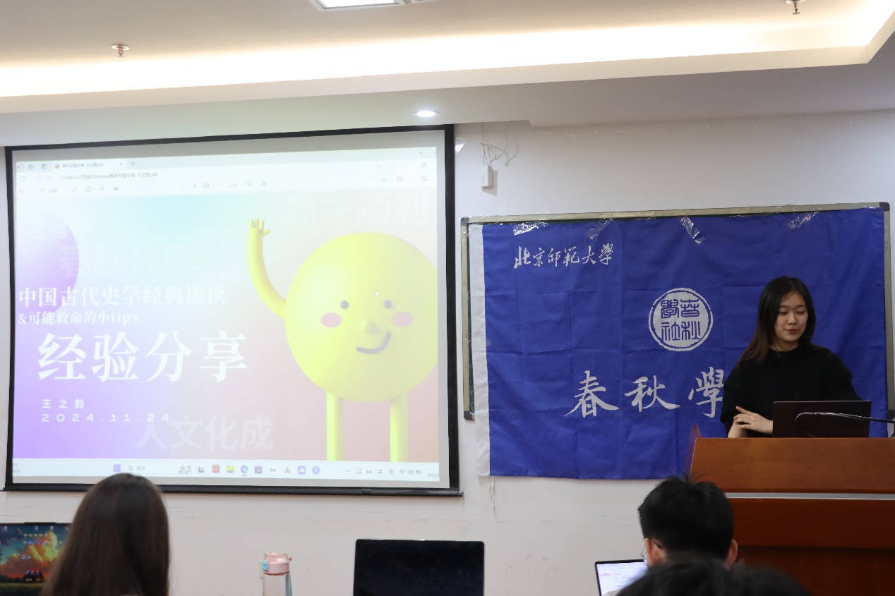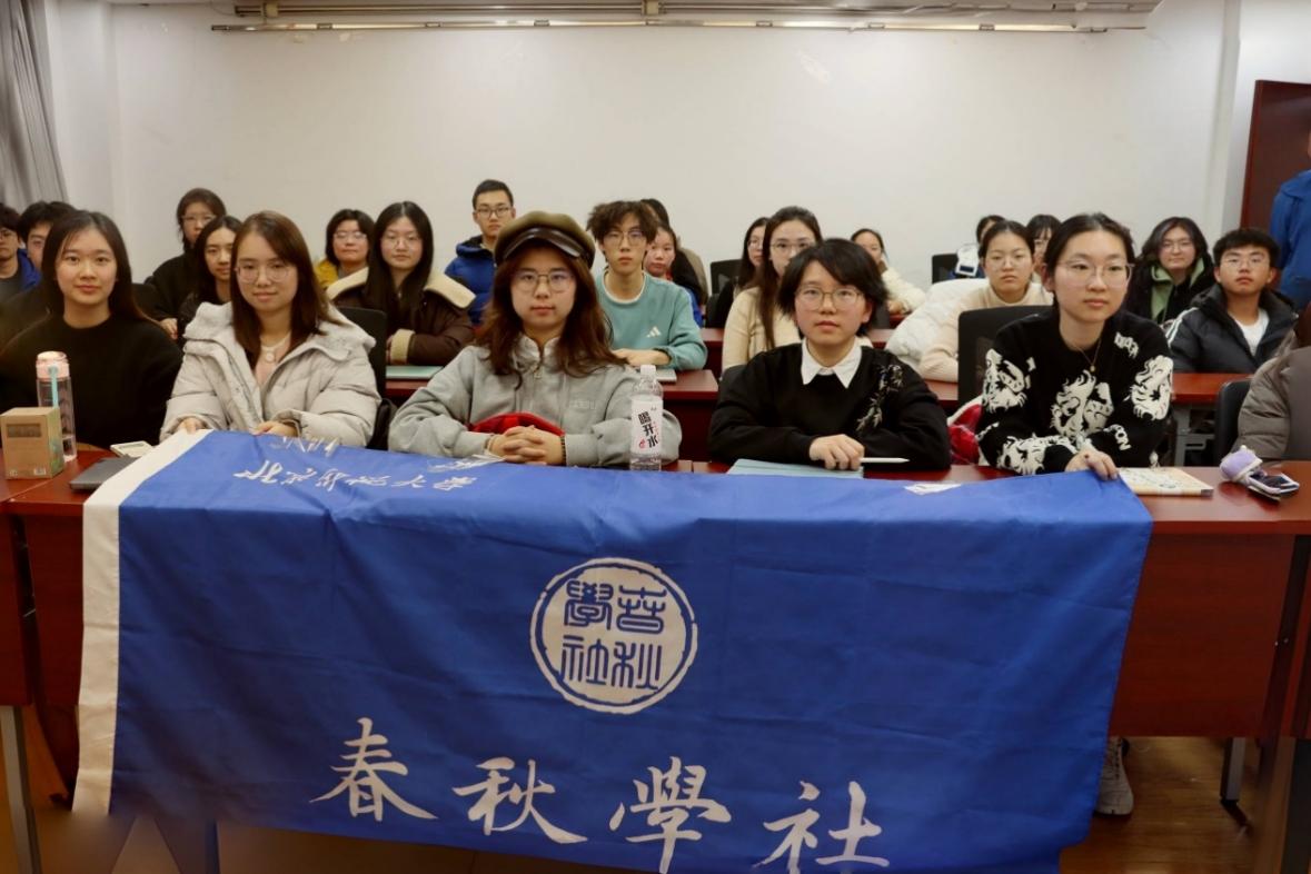11月24日19:00,春秋学社在主楼653会议室举办了期末经验分享会,本次活动邀请到历史学院2023级本科生胡灵犀、王之韵、陈致浩同学作为主讲嘉宾。本次活动由春秋学社企划部王若涵主持。