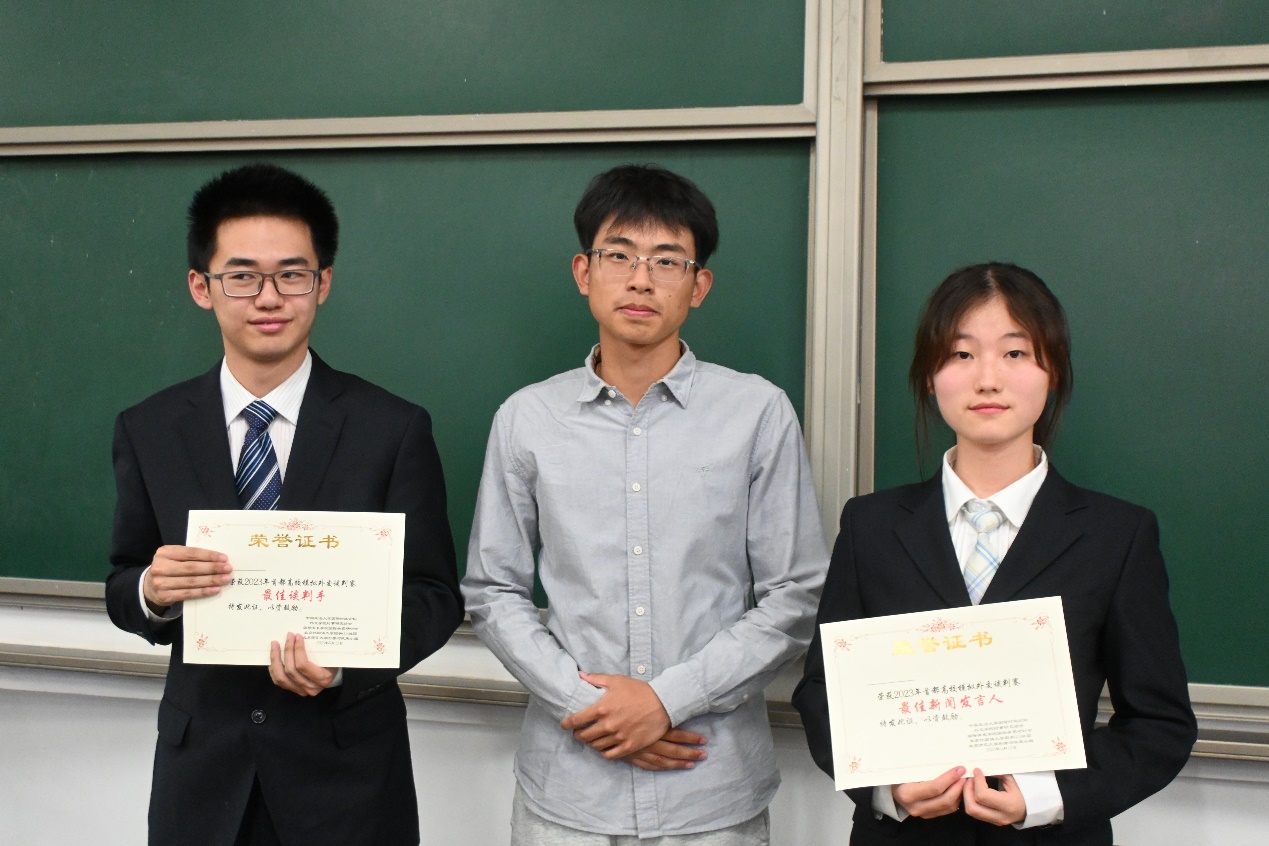 2023年5月13日,“慎思明辨”首都高校模拟外交谈判赛第二场于中国政法大学昌平校区成功举办。历史学院2020级本科生郭婧、历史学院2021级本科生晏明昊、杨新頔应邀参加比赛,荣获季军。“形势与政策”小组原学研专员周逸峰、副组长兼学研专员张正宇、宣传专员洪子阳等小组成员代表应邀前往观赛。