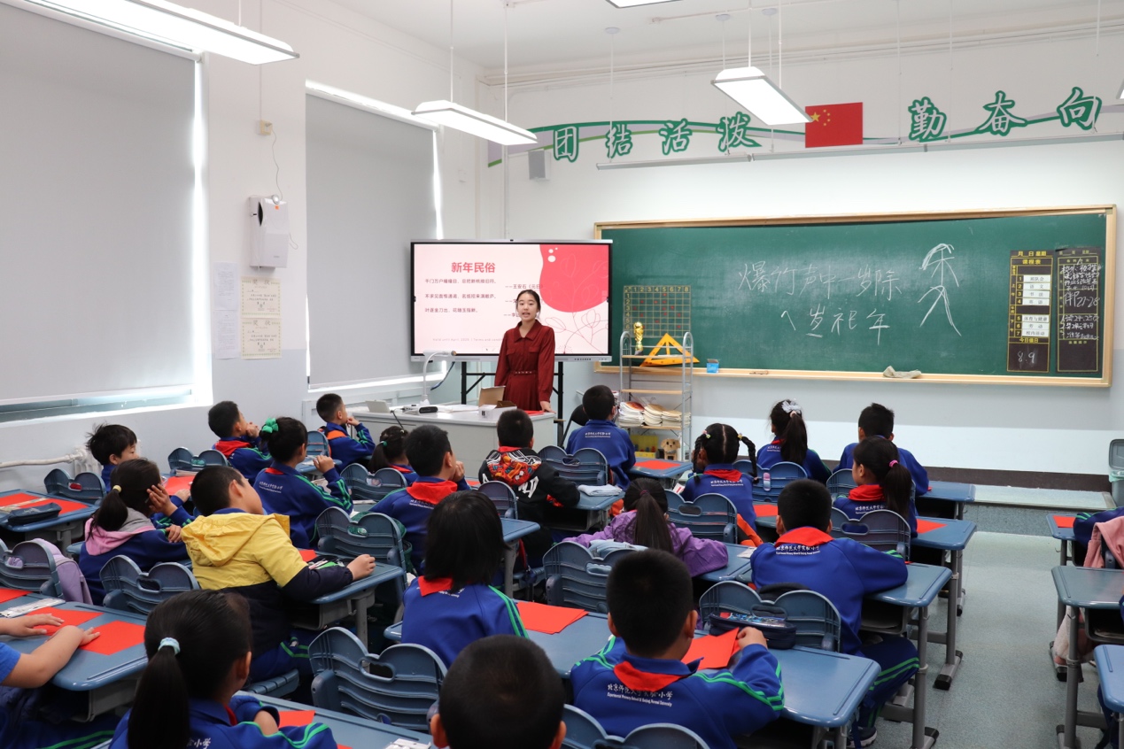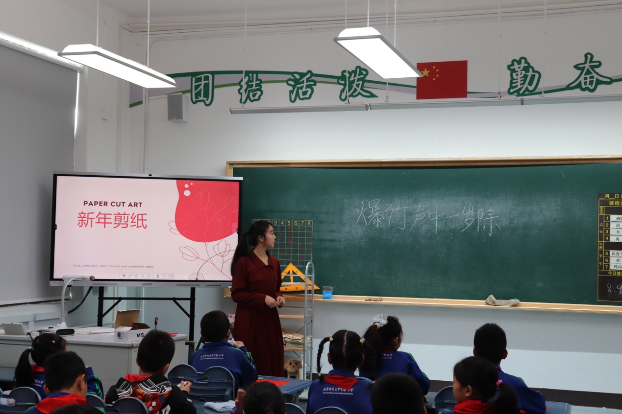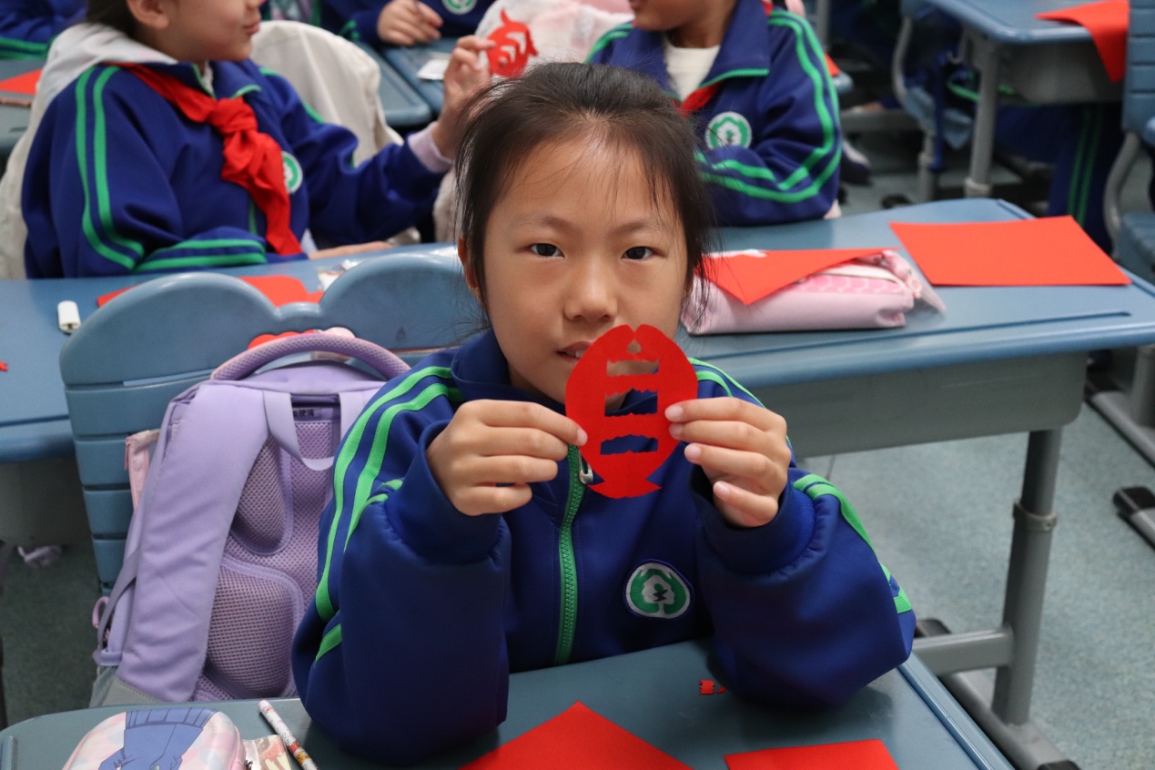 王晓茜、王若涵同学向三(1)班简要介绍了位于中国四大传统节日之首的“春节”。他们从“年兽”的古老传说切入,通过演示“年”字从古到今的演变,带领同学领略这一传统佳节形成与发展的历史。在众多“过年”的习俗中,有一项延续至今的指尖艺术——剪纸。“叶逐金刀出,花随玉指新”,一张红纸一把剪刀就能剪出千姿万态,其中每一个图案都藏着一个“吉祥密码”。每一个“密码”背后都寄托着古今人民对于“新年”的美好愿景和对于幸福生活的殷切期盼。学社成员们对剪纸的细致讲解,让同学们感受到了剪纸文化的深厚历史底蕴和独特艺术魅力。