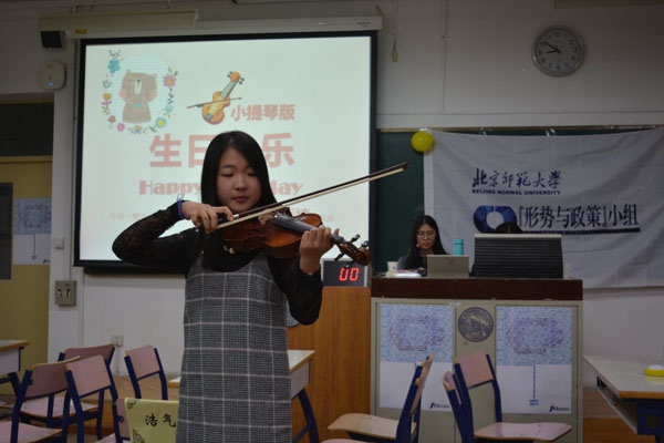 随后,晚会的节目展演正式开始。小组第十一届领导团队成员刘畅、 徐子钧、秦雅婕、彭麒霖、刘辰、张巍带来了奇妙的《杯子舞》表演,欢快的背景音乐与精彩的表演赢得全场掌声不断。张得胜同学演唱的《父亲写的散文诗》,高湘婷同学演唱的《大鱼》,钟林君、罗靖曦、陈力文同学合唱的《心墙》等节目,旋律优美,乐音悠扬,深情款款;王静怡、陈力文、钟声、高湘婷、李硕晗四位同学带来的小品《校园图书馆》,引来全场笑声连连;庞雨婕同学献上的小提琴独奏《生日快乐歌》,用婉转的琴声表达了对小组深深的祝愿。