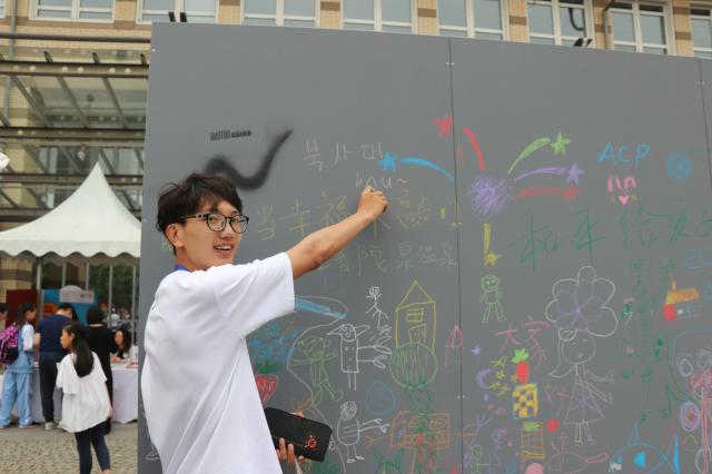 本年度德国驻华使馆开放日主题为“2019 倍儿柏林”。上午十一时,德国驻华大使葛策博士携夫人登台发表致辞。葛策大使围绕柏林墙倒塌30周年纪念对世界和平作出展望,进一步表达了对中德两国友好往来的美好期盼。本次活动将“柏林墙”搬进大使馆,邀请了3D画艺术家齐兴华和两位来自中央美术学院的同学在柏林墙上“挥毫泼墨”;之后,葛策大使和演员冯远征挥起锤子砸向“柏林墙”,再现了三十年前柏林墙倒塌的情景。活动间隙,“形势与政策”小组成员葛策大使面对面交流,介绍了小组的特色活动,并向大使先生赠送纪念品。小组成员还观看了探戈和摇摆舞表演,参与到现场“柏林墙”趣味涂鸦活动当中。活动增进了小组成员对德国史,尤其是柏林墙相关历史背景的认识,同学们对当今世界和平发展的重要性有了更深刻的体会。