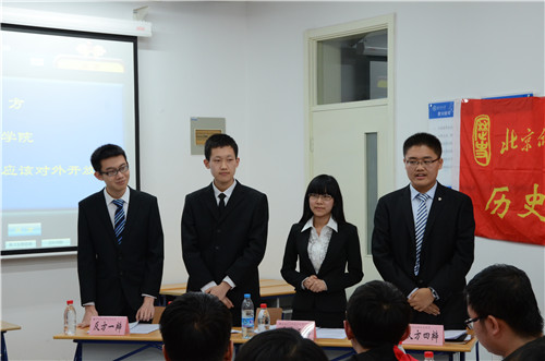 2015年4月19日21:00,第十四届“风云杯”辩论赛十六进八,历史学院对战经济与工商管理学院,比赛在教四307隆重举行。周正晓、杜建卿、孙宇飞、罗凯宇、张晓涵等各高校的辩论队队长和最佳辩手应邀出席并担任评委。本次比赛的辩题是“高校图书馆到底应不应该对外开放”,我院持反方观点,即“高校图书馆不应该对外开放”,双方激烈交战,精彩纷呈。最终历史学院惜败,止步于八强之外。