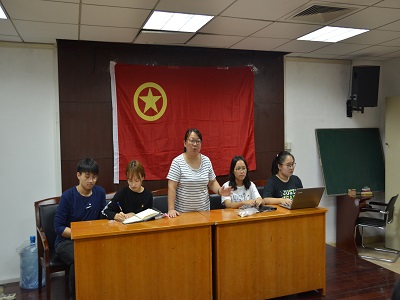 会议在庄严的共青团团歌中拉开序幕。会议开始,首先由本科生团总支书记田苗苗对此次招新工作进行了初步总结,提到了招新过程中18级新生们积极参与学生工作的热情和分团委此次招新工作的丰硕成果,强调了新媒体公众号平台在招新过程中发挥的作用,并宣读了第39届分团委团干事名单。随后,由分团委书记胡小溪老师、副书记邢海和宿雅婷以及本科生团总支书记田苗苗为新生团干事佩戴团徽并合影留念,以镜头定格下这具有纪念性意义的一刻。在会议的最后,胡小溪老师发表了讲话,提出新一届团干事不仅要完成身份的跨越,更要完成角色的转变,通过执着的精神与事业心来证明自己的优秀,在团学工作中收获成长。