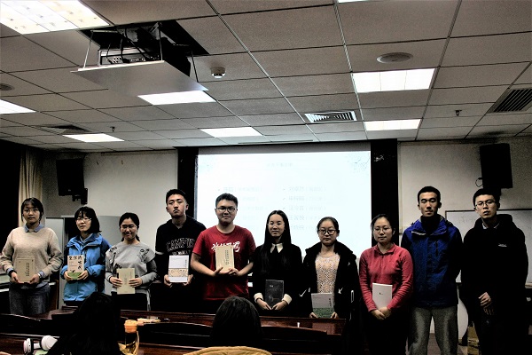 首先,社长陈兴带领大家回顾了本学期学社举办的活动,展示了活动照片。过去的一学期中,学社举办了形式多样、丰富多彩的活动,如讲座、读书会、参观国家博物馆、校尉小学讲课等等,相信大家在一学期的活动中收获颇丰。随后,学社表彰了这一学期的优秀干事,各部长为他们赠送了史学书籍。接下来是紧张的抽奖环节,通过有趣的活动,有10位幸运儿收获了学社精心准备的奖品,全场气氛活跃。
