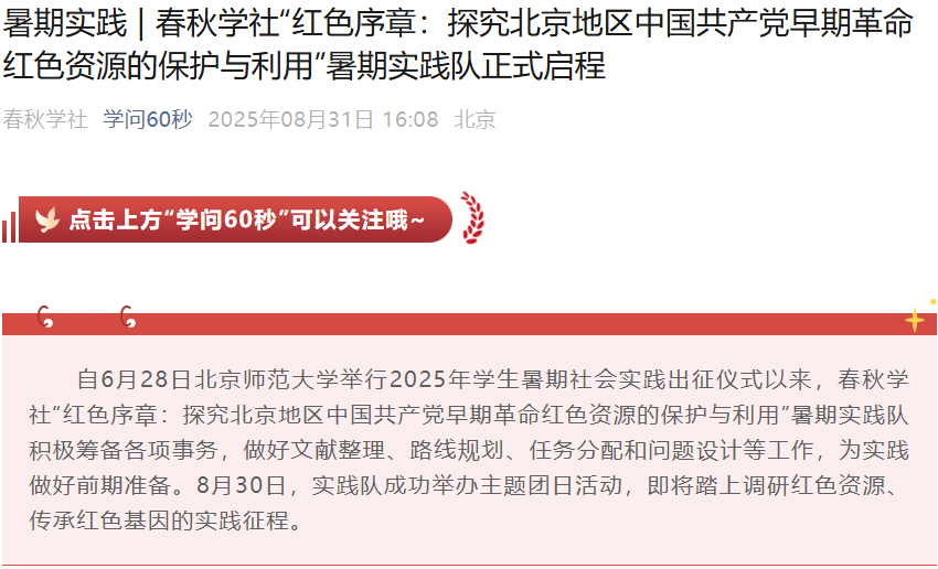 实地调研结束后,实践队马不停蹄地整理了调研内容,并调出前期搜集的文献资料对读,复盘调研思路,整合研究成果。随后,实践队借助社团、学院、学校的新媒体平台进行成果宣传,推动公众系统性了解中共早期北京红色资源的现实情况,增强文化自信。