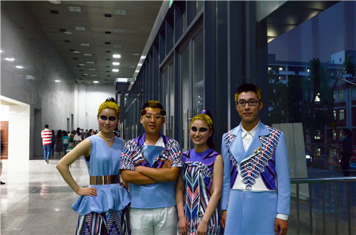 在群秀的环节中,历史学院为第三版块的第二个出场院系。模特们头敷金粉,冷艳出场,震撼全场。女模特口衔凤凰雕饰,男模特多背金色小包。服饰以蓝紫条纹衫为主打,寓意华夏古典纹章;以金色饰物为点缀,象征凤凰正统,高度契合了“九霄环佩,凤吟神州”的主旨。历史学院的服饰设计独具特色,时尚实用感极强,走强势白领风; 剪裁优雅利落,简而不约,低调中彰显奢华。历史不仅专于过去,更能知于当下,走秀结尾,萌萌的“大白”上场,为这场走秀融入了最新的流行元素,也带动了一次全场的高潮。在之前院系或妖异或梦幻的衬托下,历史学院的服饰如一阵凌厉的风,得到一致好评。历史学院模特们向全场完美展示了历史学院基于传统,与时俱进,古典与时尚相结合的学院风格。