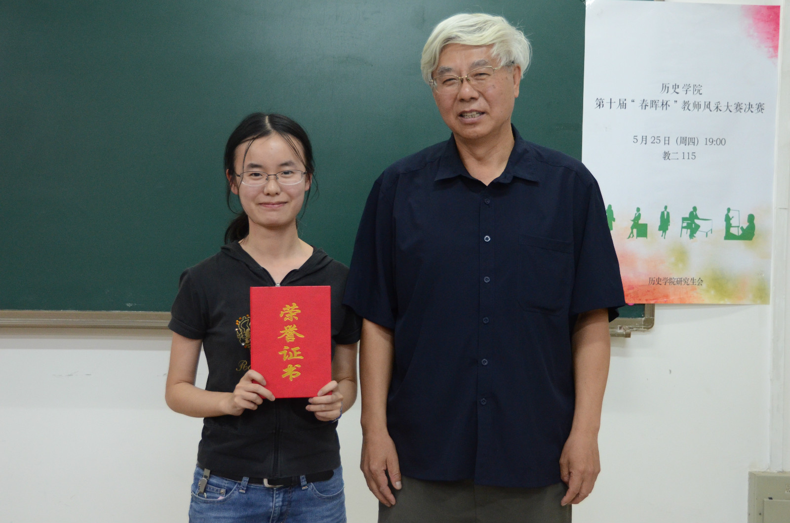5月25日晚七点,由历史学院研究生会主办的第十届“春晖杯”教师风采大赛在教二115教室顺利举办。本次比赛邀请了历史学院马卫东老师、李凯老师,来自北京101中学的校友李霞、北方交通大学附属中学的校友王信担任本次决赛的评委。