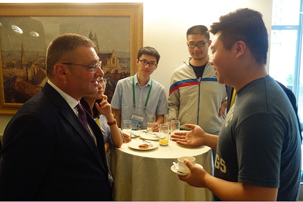 随后,路德维特参赞先带领我院师生进入古朴典雅的使馆主建筑,并在一层主会议室与大家进行了亲切友好的交谈。他首先回顾了捷克与中国的传统友谊:原捷克斯洛伐克是首批与新中国建交的国家之一;1993年捷克成为独立主权国家后,长期同中国保持着良好的双边关系,并通过建立孔子学院等增进两国文化交流。欧盟同样是捷克对外交流的重要平台,历史上捷克有着很强的欧洲认同,加入欧盟为捷克的发展带来了历史性机遇。在欧盟框架下,捷克与中国通过“一带一路”战略和中国-中东欧国家“16+1”合作机制,建立起更紧密的经济文化联系。