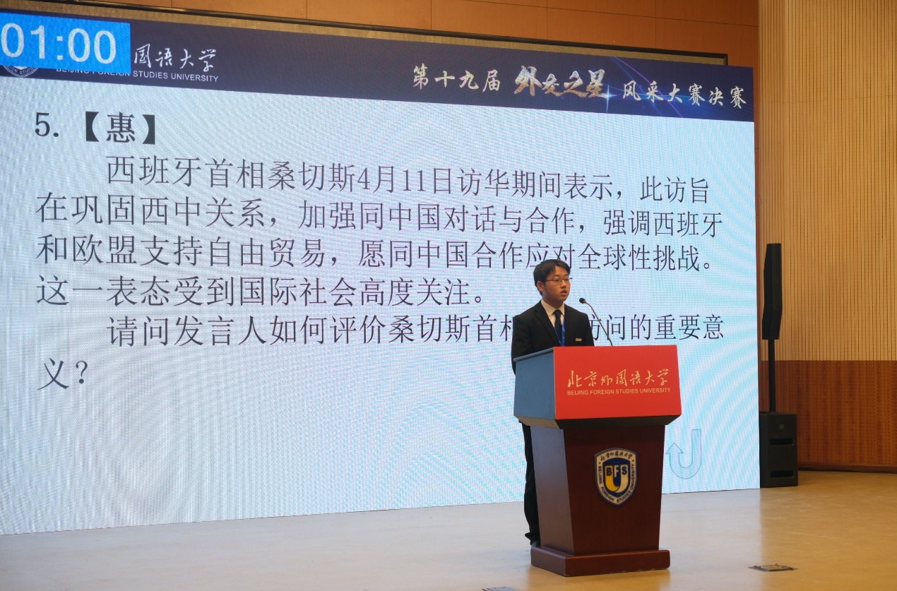 决赛共有四个组成环节,分别是“判断题”、“模拟外交部发言人”、“轮答选择题”、“图片竞猜题”。我校代表队成员沉着冷静,泰然自若,深厚的外交时事素养和出色的临场表现赢得了现场评委和各方观众的热烈掌声。在“判断题”环节,我院屈威洋同学从容不迫,凭借敏捷的思维和渊博的知识,成功攻克八题,奠定了我校代表队的领先优势。在“模拟外交部发言人”环节,我院李炳科同学就西班牙首相桑切斯访华议题回答记者提问,精准定位了此访的战略节点与核心议程,系统阐释了两国在经贸、人文等领域的双边互惠合作成果;在高难度的追问环节,他立足中欧多边合作框架和全球治理体系,并以中方在乌克兰危机上的劝和促谈努力为例,阐释新时代中国特色大国外交的智慧与担当,带领我校代表队成功晋级。