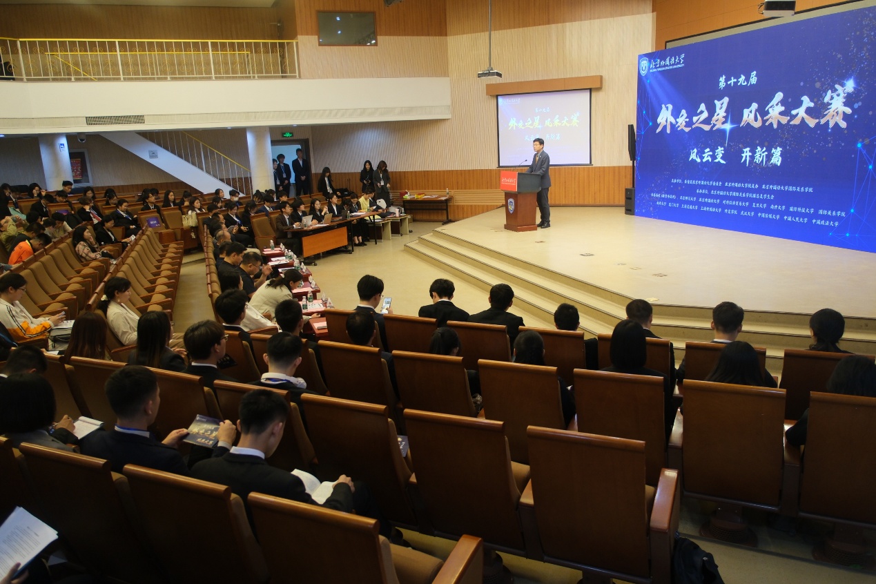 第十九届“外交之星”风采大赛以“风云变·开新篇”为主题,由共青团北京外国语大学委员会、北京外国语大学校友办、北京外国语大学国际关系学院主办,北京外国语大学国际关系学院团总支学生会承办,共分为初赛、决赛两场比赛。经过初赛角逐,共有包括复旦大学、厦门大学、南开大学、中国人民大学、北京师范大学代表队在内的十五支代表队进入决赛。前中华人民共和国驻马里、摩洛哥王国大使馆大使程涛、前中华人民共和国驻刚果、黎巴嫩共和国大使馆大使吴泽献、外交学院国际组织与全球治理教研室主任牛仲君等嘉宾莅临现场担任评委。北京外国语大学党委常委、副校长赵刚在开幕式上致辞,表达了对本年度大赛的期望以及对选手的祝愿。