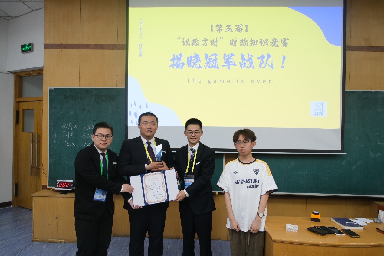 2025年5月18日晚,第五届“议政言时”国际政治知识竞赛在中国政法大学昌平校区举办。由我院2023级硕士研究生周逸峰,2021级本科生杨新頔和文学院2023级本科生吴怡组成的北京师范大学代表队再次摘得桂冠。“形势与政策”小组副组长吴自嵘、龙思翰,组织专员区彦瑜,学研专员屈威洋和部分新老成员等也赴现场观看了比赛。