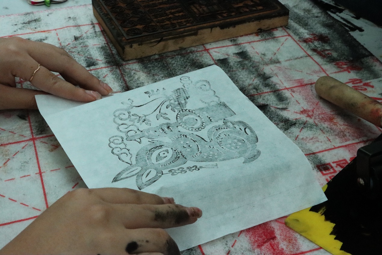 在本次活动中,春秋学社准备了纹样精美的木刻版画和各色油墨,引导同学们体验雕版印刷的乐趣。首先将油墨挤到塑料板上,用滚轮均匀抹平;然后将沾有油墨的滚轮在版料上滚动,使其充分着墨;最后将宣纸铺展在版料上,用工具反复按压使图案显现于纸上。一张栩栩如生的兔子版画或穿越千年的纸币交子便形成了。