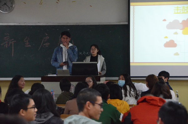 晚八点,郑嘉祥和陈力文两位主持人宣布班会正式开始,并为同学们简述本次班会举办的目的及意义,同时,向同学们简要介绍了班会流程以及游戏规则。紧接着,班建活动正式开始。第一个游戏是击鼓传花。击鼓传花游戏有着很好的暖场效果。当鼓声停止,手持花球的同学有的选择了表演节目,有的则选择了喝下班委准备的崂山蛇草水以示小小的“惩罚”。第二个活动是你划我猜。同学们分为十个不同的小组,每个小组分别派出负责比划的同学和猜迷底的同学进行比赛。经过三轮的比赛,选出第一、二、三名,并发给这三个小组几包薯片以示奖励。第三个活动是谁是卧底。在班委向全班同学做完游戏示范后,我们选取10位同学上台参与活动。游戏共有3轮,三轮结束后,选出优胜者并予以奖励。