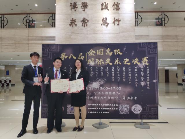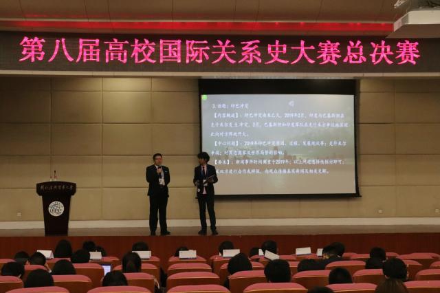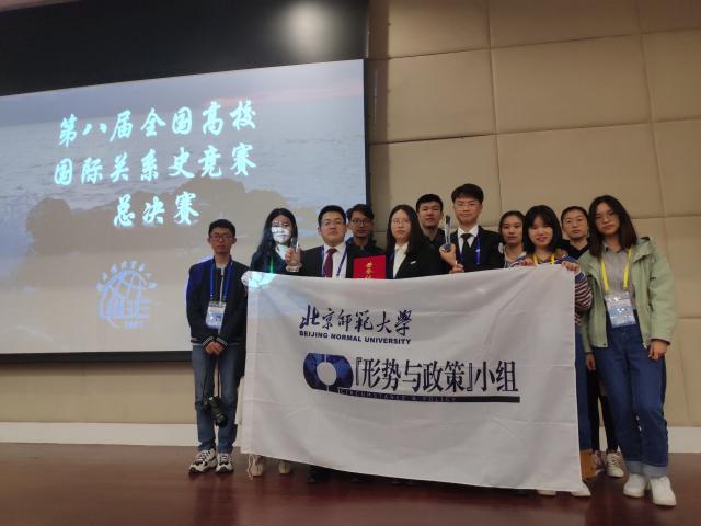 2019年4月27日下午,第八届高校国际关系史大赛总决赛在对外经贸大学成功举办。由我校教育学部2015级本科生赵文博、历史学院2016级本科生洪思音、历史学院2018级本科生唐洪超组成的北京师范大学代表队应邀参加比赛,最终荣获亚军。我院“形势与政策”小组组长秦雅婕、秘书长陈雁、宣传专员胡潇予等前往现场观摩了比赛。