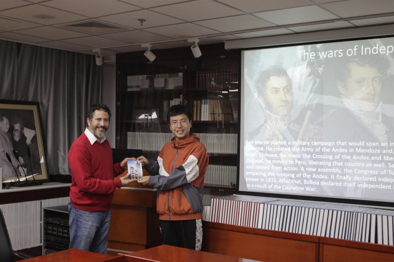 随后,毕嘉宏教授以时间为线索,介绍了自1810年圣马丁领导五月革命至21世纪以来阿根廷的重大历史事件,并重点就政治思潮、移民与族群结构、中阿经贸往来等大家感兴趣的话题作了讲解与探讨。活动最后,毕嘉宏教授回答了在座同学关于阿根廷大选、秘鲁与智利政局、拉美国旗图案、西班牙语在拉美流变以及中国古典文学等方面的提问,并向发言同学赠送了纪念品。
