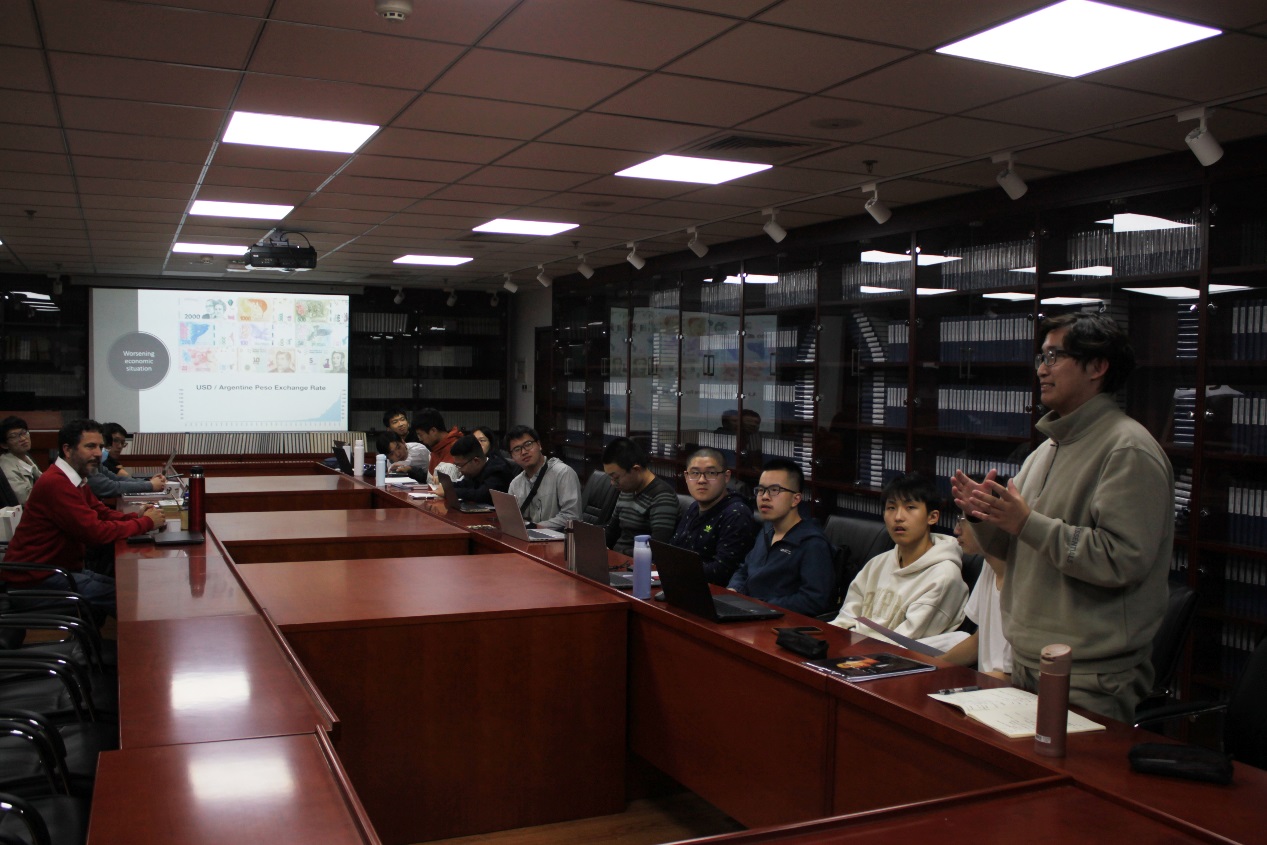 11月2日晚,拉丁美洲中国研究学会主席、阿根廷布宜诺斯艾利斯大学社会科学学院阿根廷-中国研究中心主任毕嘉宏(Ignacio Villagrái)教授以“阿根廷的历史与现实”为题,在主楼700会议室与我院学生进行了分享交流。历史学院中国古代史教研室主任罗新慧教授莅临活动现场。“形势与政策”小组组长李远哲,原常务副组长杨憬添,学研顾问张熹、张正宇,第十七届领导团队部分成员等新老成员代表参加交流活动。