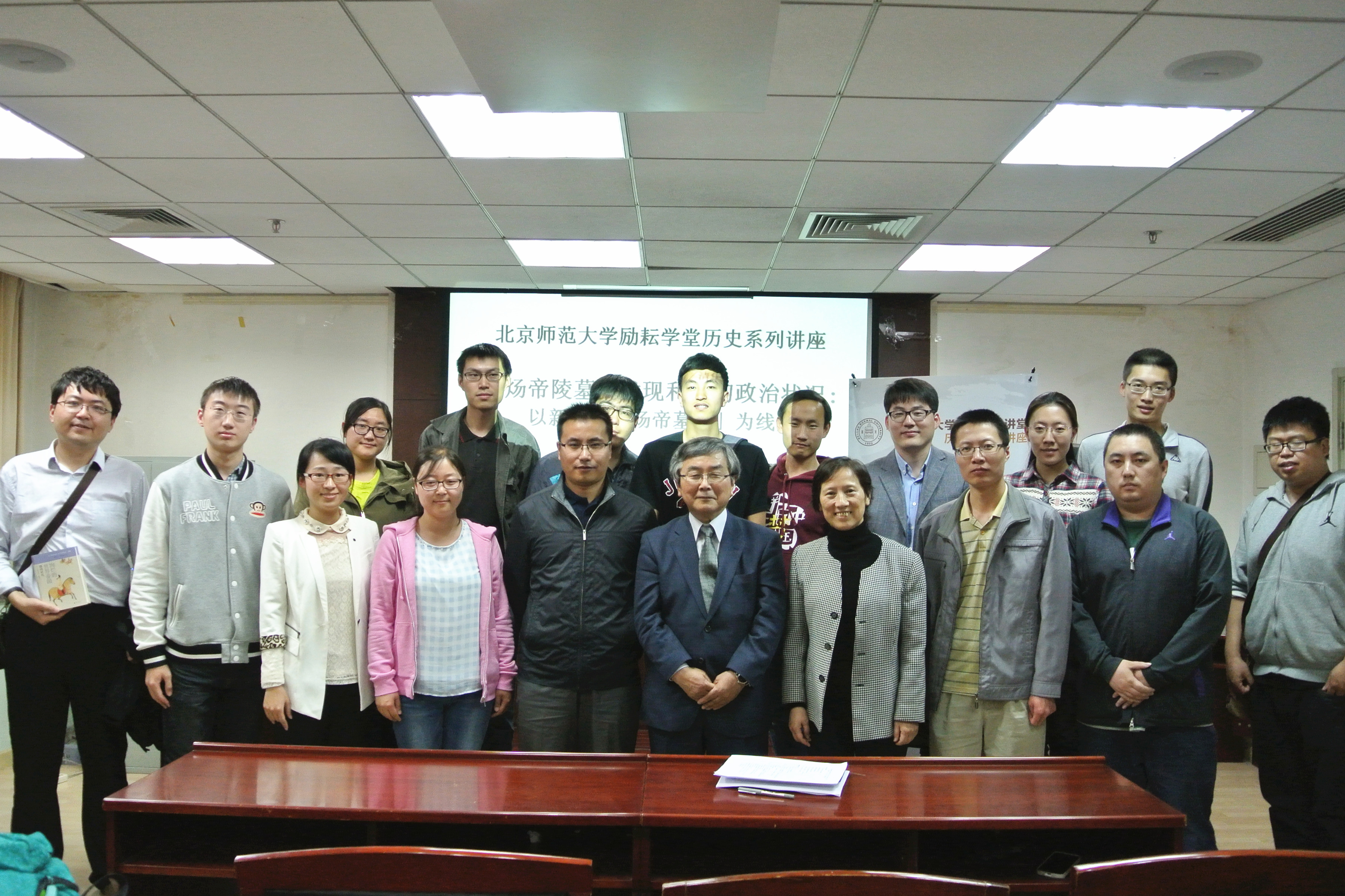 气贺泽保规教授对墓志进行了释读,订正了目前公开出版的一些释文中的错误,认为墓志作于贞观九年。他又将墓志与《文苑英华》所载《唐太宗文皇帝哀册文》进行了比较,发现该墓志虽然使用石板墓志的形式,但却采用了皇帝驾崩时所发布哀册的文体,认为这是唐太宗以前朝皇帝礼仪埋葬隋炀帝的表现。在此基础上,气贺泽保规教授分析了隋末至贞观初年的政治、经济情况,并据此分析了从隋末到太宗时期统治集团对于隋炀帝评价的转变及其与隋末唐初政局嬗变的关系。随后,师生们就感兴趣的问题向气贺泽保规教授作了提问。