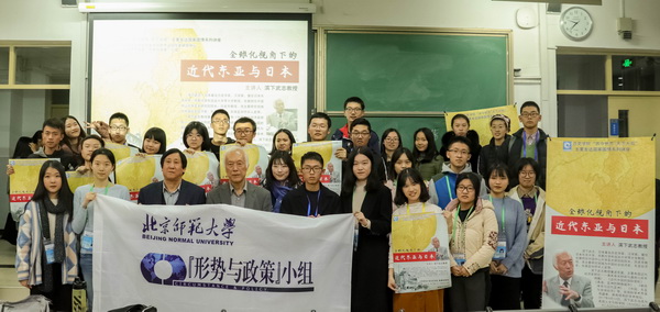 2018年11月6日晚,日本著名历史学家滨下武志教授应邀来到北京师范大学,在教二101教室作以“全球化视角下的近代东亚与日本”为主题的专题学术讲座。此次讲座系历史学院“古今世界,天下大观——主要发达国家国情系列讲座”的第十二讲,标志着历史学院2018年“国际文化月”正式拉开帷幕。讲座由历史学院世界近现代史研究中心、“形势与政策”小组共同主办。我院陈奉林教授担任讲座主持人。中国社会科院近代史研究所高士华研究员,我院中国近代史教研室张昭军教授、贾琳老师等出席了讲座。本次讲座恰逢“形势与政策”小组第100次集体学习,也吸引了众多高校学生与历史爱好者前来聆听,现场座无虚席,盛况空前。