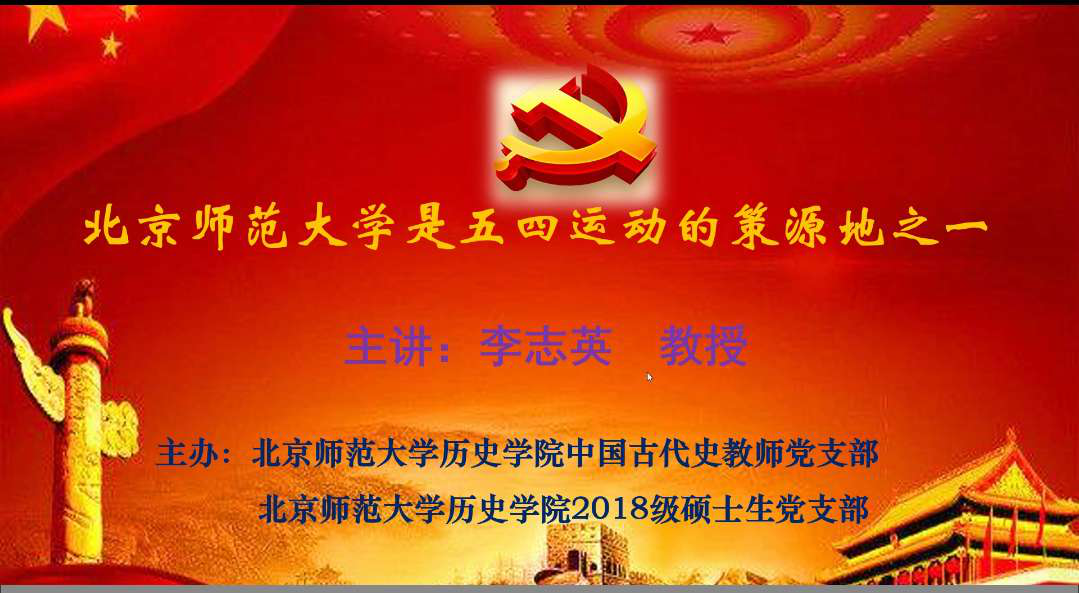 2020年5月28日上午,新爱体育(官网)官方网站中国古代史教师党支部与2018级硕士生党支部开展支部共建举办主题党日活动,邀请历史学院李志英教授为各位师生党员作题为《北京师范大学是五四运动的策源地之一》的专题讲座。受新冠肺炎疫情影响,讲座采用腾讯会议平台进行,师生党员共计60余人在线聆听了此次精彩讲座。讲座由中国古代史教师党支部书记陈涛主持。