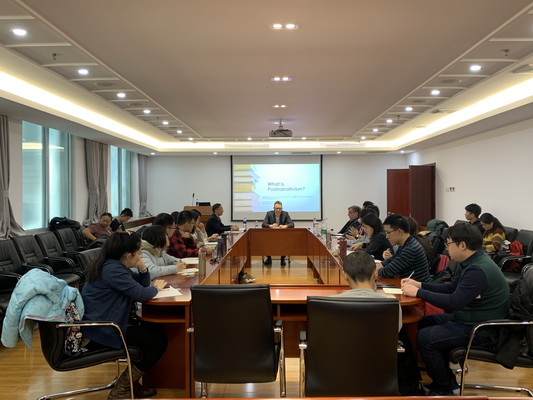 17日下午14时,罗斯教授开展题为“哈金的史学?”(Hacking's Historiography?)的讲座。罗斯教授开宗明义地指出,在西方学术传统之中,科学解释必定会使用形式逻辑和普遍规律,因此历史解释往往被排除在科学解释之外;但通过对伊恩·哈金作品的考察,他认为解释的逻辑必须扩展到将历史解释包含在内,历史不必符合科学模型,叙事解释已经是一种完全合法的解释形式。接下来罗斯教授之处,哈金之学说的有趣之处在于,他关注的不是库恩及前库恩时代强调的科学理论与理论的形式逻辑,而是科学家的实际工作及一门科学何以呈现出当下的样貌。在米歇尔·福柯的“监视”与“知识-权力”概念的深刻影响之下,哈金认为每一门科学都有其“推理风格”,必须要将概念置入特定的逻辑空间中进行考察。在研究一门科学是如何获得其稳定地位的过程中,哈金实则提供的是一种叙事;借助阿瑟·丹托提出的“叙事句子”概念,我们也可以将其理解为一种回溯性的历史解释。的确,历史解释跟科学解释不同,不是标准化的,但这并不会妨碍其稳定性和解释效力。讲座最后,罗斯教授以海登·怀特的话作结:“我们不仅选择了我们的未来,也选择了我们的过去。”在随后的提问环节中,罗斯教授就“叙事句子”的真实性或合理性、史学的叙事性和叙事解释的边界、历史学家的书写行为与政治行为、分析哲学语境下的“真”之概念与当今史学发展的碎片化倾向等问题与同学们进行了长达七十分钟的热烈讨论。