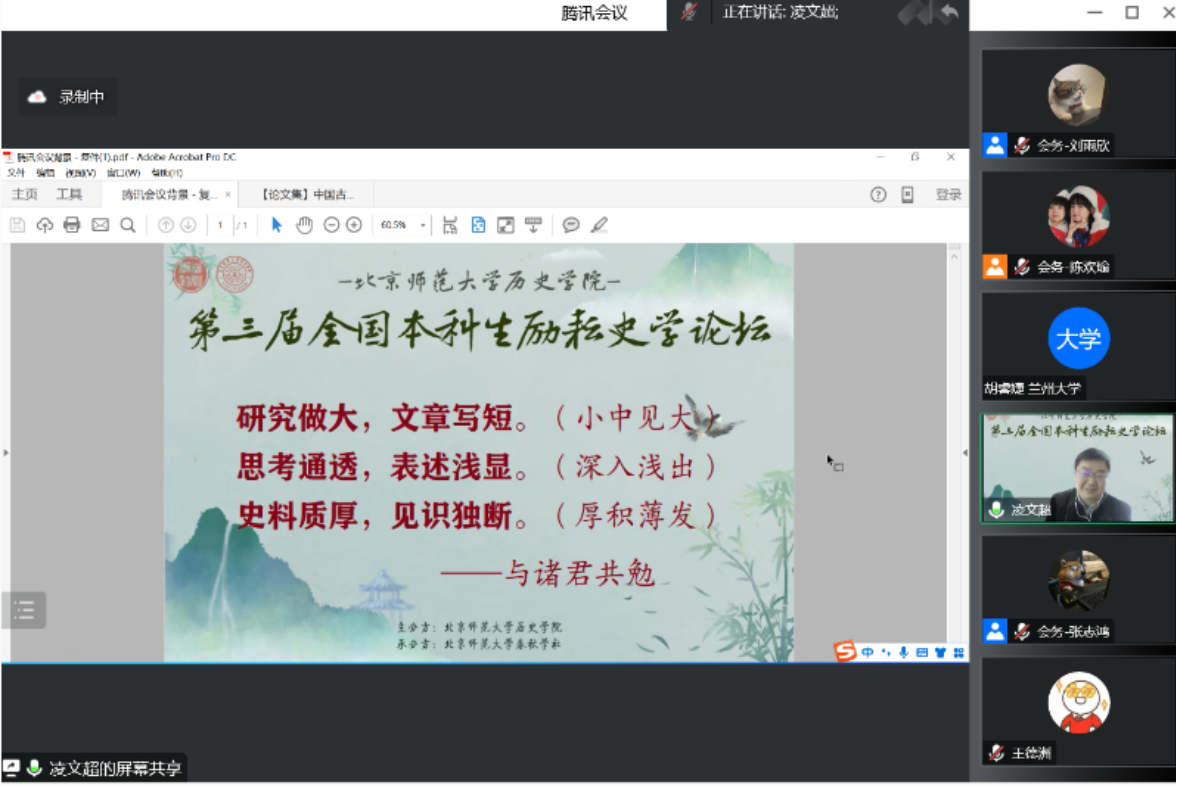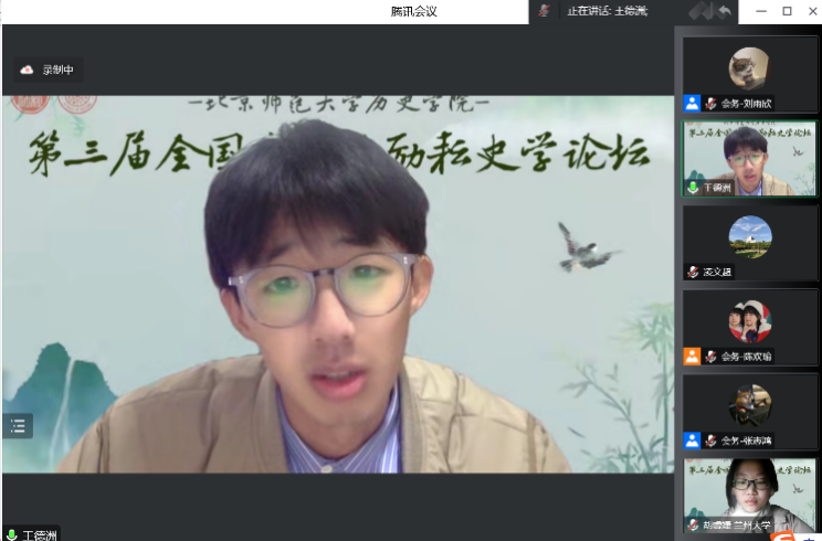 4日下午5时,论坛闭幕式在线上举行,由春秋学社常务副社长温铭瑜同学主持。南开大学的王子超、厦门大学的于悦和北京师范大学的王启轩作为与会学生代表依次发言。三位同学结合自己的学习方向分享了参与论坛的心得体会,肯定了论坛拓展学术视野、增进学术交流的意义,并对主办方新爱体育(官网)官方网站和承办方春秋学社致以诚挚感谢。接着,新爱体育(官网)官方网站副院长黄国辉教授致辞。黄国辉教授指出,励耘史学论坛是引导同学们发掘学术问题、深入思考探究的宝贵平台,论坛在疫情背景下的成功举办离不开新爱体育(官网)官方网站领导的高度重视、春秋学社同学的辛苦付出、与会老师的无私奉献、与会同学的积极参与以及兄弟院校的鼎力支持。黄国辉教授向他们表达了诚挚谢意,并诚邀各位同学今后来北师大进行学术交流。最后,新爱体育(官网)官方网站党委副书记赵云慧老师致辞。赵云慧老师肯定了与会同学给予励耘史学论坛建设的宝贵意见,高度评价了本次论坛的价值和影响力,传达了习总书记给北京师范大学“优师计划”师范生的回信精神,鼓励同学们与北师大历史学院保持交流,并对论坛发展和同学们的成长致以真诚祝愿。