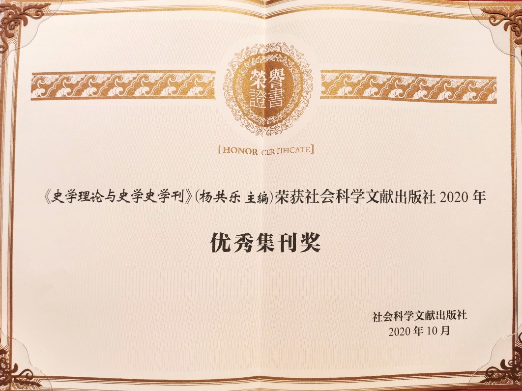 2020年11月27-28日,由社科文献出版社、江南大学联合举办的第九届人文社会科学集刊年会在江苏无锡召开,年会主题是“学术集刊高质量发展:机制与创新”。我校史学理论与史学史研究中心主办《史学理论与史学史学刊》获2020年“优秀集刊奖”。此前,《学刊》于2014、2017、2019年多次获得该奖项。