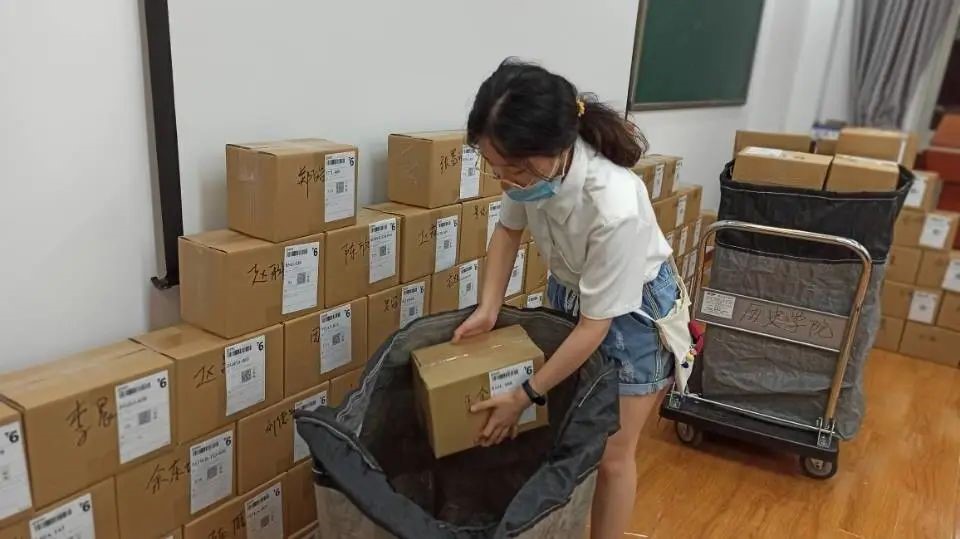 自6月28日起,历史学院开始了毕业生行李委托打包邮寄工作,在校学生志愿者在总务员工的协助下为同学们打包行李。视频直播中,“阿姨,我想要这个被套”,后勤的阿姨便麻利的将被套拆下叠好放入箱子。公共区域的物品,落在水房的衣物,床底遗漏的小东西,后勤员工和志愿者都在直播中帮同学们一一找寻,将需要的物品妥善收纳。